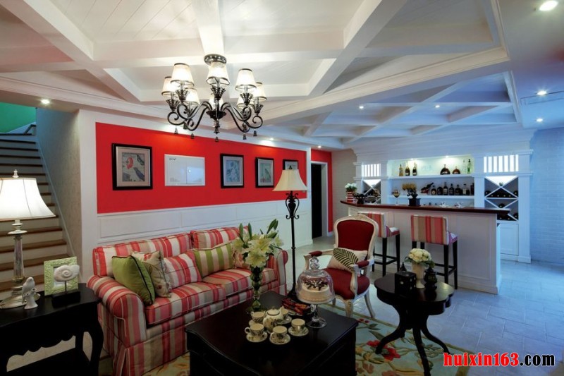 在客厅的墙面上大胆的采用鲜绿色作为装饰,在客厅的顶面上采用石膏板制作了一些简单的横梁的结构,在中央悬挂一盏复古造型的吊灯,看起来非常的雅致大方。各种颜色的布艺沙发搭配出非常舒适惬意的居室环境。在沙发边桌上摆放着一个蓝色的瓷瓶底座的台灯,看起来非常的有质感,提升了空间的艺术享受。绿色的墙面搭配白色的门套,色彩的对比也非常的鲜明。