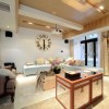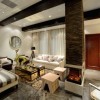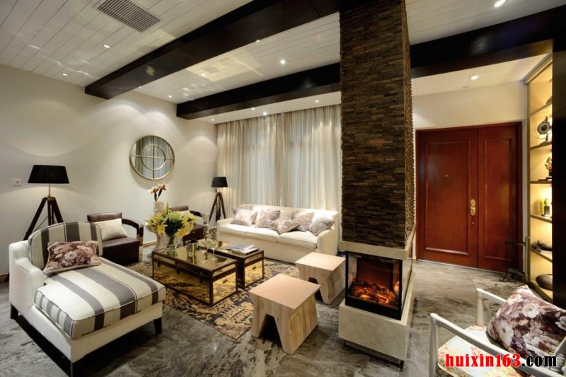 客厅的装饰最大的特点就是返璞归真的亲近大自然的设计风格,在客厅的顶面上是两道很黑色的方木横梁,横梁横贯整个房间,在两道横梁之间还有很多的白色的杉木板以及射灯的设计,经过顶面和墙面的光线的反射,顶面除了射灯已经不需要其它额外的光源,给人的感觉非常的整洁。在客厅中央的位置一个文化石装饰的方柱和一个装饰壁炉有机的结合在一起,旁边摆放两个实木的小凳子,让人混淆了记忆和现实。