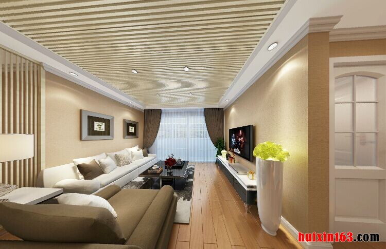 简约风的装修布置,所展现的是一种现代生活所追求的时尚与潮流感,在客厅的装饰当中,简单的家具陈设,浅色系的色彩搭配,营造出一种浪漫、清新的氛围,个性的吊顶设计,在视觉感观上给人展现出一种动态感,实木铺设的地板,在装饰效果以及体验效果上都有着良好的感觉,落地窗的设计搭配上轻质的窗帘,让空间的采光显得比较明亮透彻,整个空间的色彩基本上是以暖色系为主,为空间展现出一种浪漫温馨的氛围,墙面四周射灯的安装,若影若现的灯光,犹如一种繁星点缀的效果,电视柜旁一盆装饰花卉的摆放,在通过灯光的营造也展现出一种别样的美感。