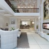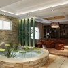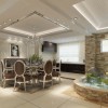 本套为混搭风格装修,餐厅地面采用的是大理石装修,吊顶采用石膏板进行平顶吊顶,石膏板上的银色茶镜,增加了空间的亮度,餐厅是采用欧式的风格,高端大气上档次的餐桌,一家人围绕餐桌一起吃饭,非常的热闹,美丽的吊式水晶灯绽放出耀眼夺目的光芒,显现出华丽尊贵的气质,倚仗一身通体晶莹的串串垂饰,如若层层叠叠的晶莹果实,垂饰大小体形不一,装饰着宽阔的餐厅,餐厅旁边还有一个不大不小的水池,池里有“出淤泥而不染,”的莲花,美丽极了,空间整体营造出富贵浪漫的氛围。