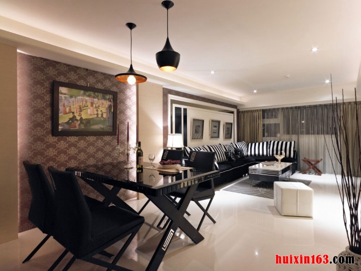 简约宽敞的吊顶设计,平直顺畅的线条,给人简明利落且大气之感。开放式的家居结构设计,也突显出了家居的结构优势,开敞通透。石膏线框结合茶色镜打造的沙发背景墙,立体且富有层次感,装饰画点缀,让背景墙更显丰富。纯黑布艺转角沙发,白色勾边线条让沙发更显立体,黑白相间的条纹靠枕,强烈而鲜明的对比,经典且时尚的色彩搭配,整体感觉端庄时尚、稳重大气,简约中不乏高雅之感。格栅造型电视背景墙设计,棕色花纹墙纸装饰,增加了背景墙的优雅感,挂壁式电视柜简洁朴素,看上去素雅而端庄。